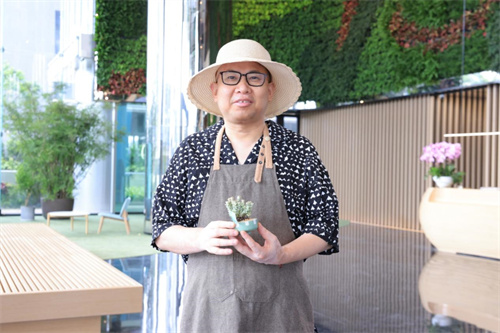 茵曼品牌创始人方建华,再新大楼入驻当天,化作园丁为员工送绿植