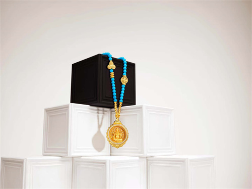 「绿松石黄财神嘎乌盒吊坠」堪称品牌“见微知著”精神的巅峰体现。它将护佑财富的黄财神法相,以黄金微雕工艺浓缩于方寸之间,让佩戴者珍藏独属自身的祝福或纪念,寓意汇聚财气与好运的随身护佑。
